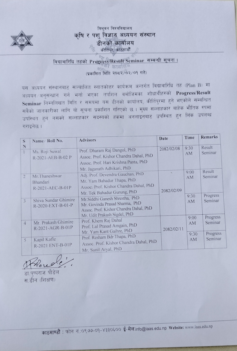 विद्यावारिधि तहको Progress Seminar सम्बन्धी सूचना ।