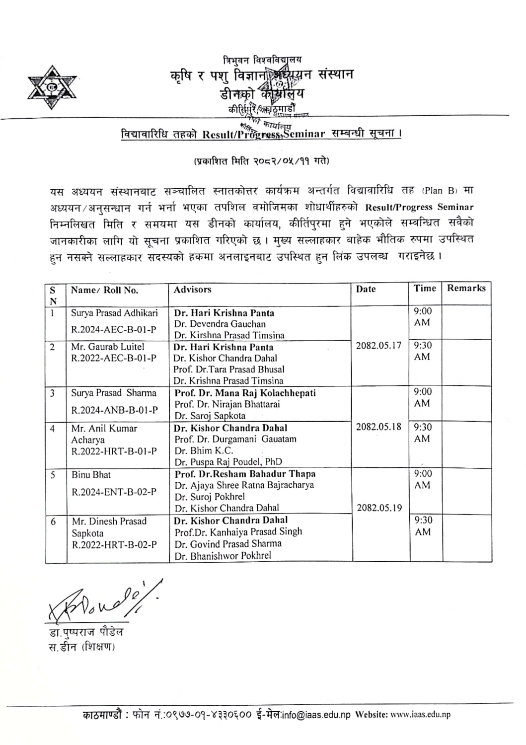 विद्यावारिधि तहको Progress Seminar सम्बन्धी सूचना ।